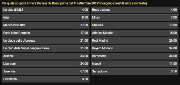 Piuttosto basse anche le quote che lo vedrebbero in Premier: lo United è dato a 17, come il Chelsea qualora gli venisse sbloccato il mercato. A 15 invece l’Atletico di Simeone, che non ha mai nascosto l’apprezzamento per De Rossi, le cui caratteristiche sembrano però sposarsi più col campionato inglese che con quello tecnico e ad andamento lento spagnolo. Sullo sfondo le mete esotiche arabe ed australiane, fino ad una possibilità asiatica, apparentemente lontana dai desideri del Campione del Mondo del 2006.