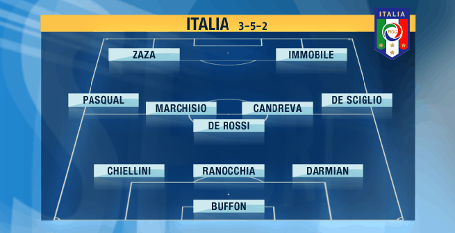 Italia (3-5-2): Buffon; Darmian, Ranocchia, Chiellini; De Sciglio, Marchisio, De Rossi, Candreva, Pasqual; Immobile, Zaza.
